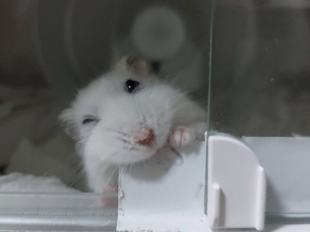 保護初日は落ち着かなかったようで、手にも平気で乗ってあちこち匂い確認、ケージでは床材をごそごそしたり回し車を爆走したり側面の空気穴をクライミングしようとしたり活発に動いていました。