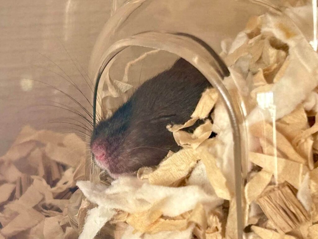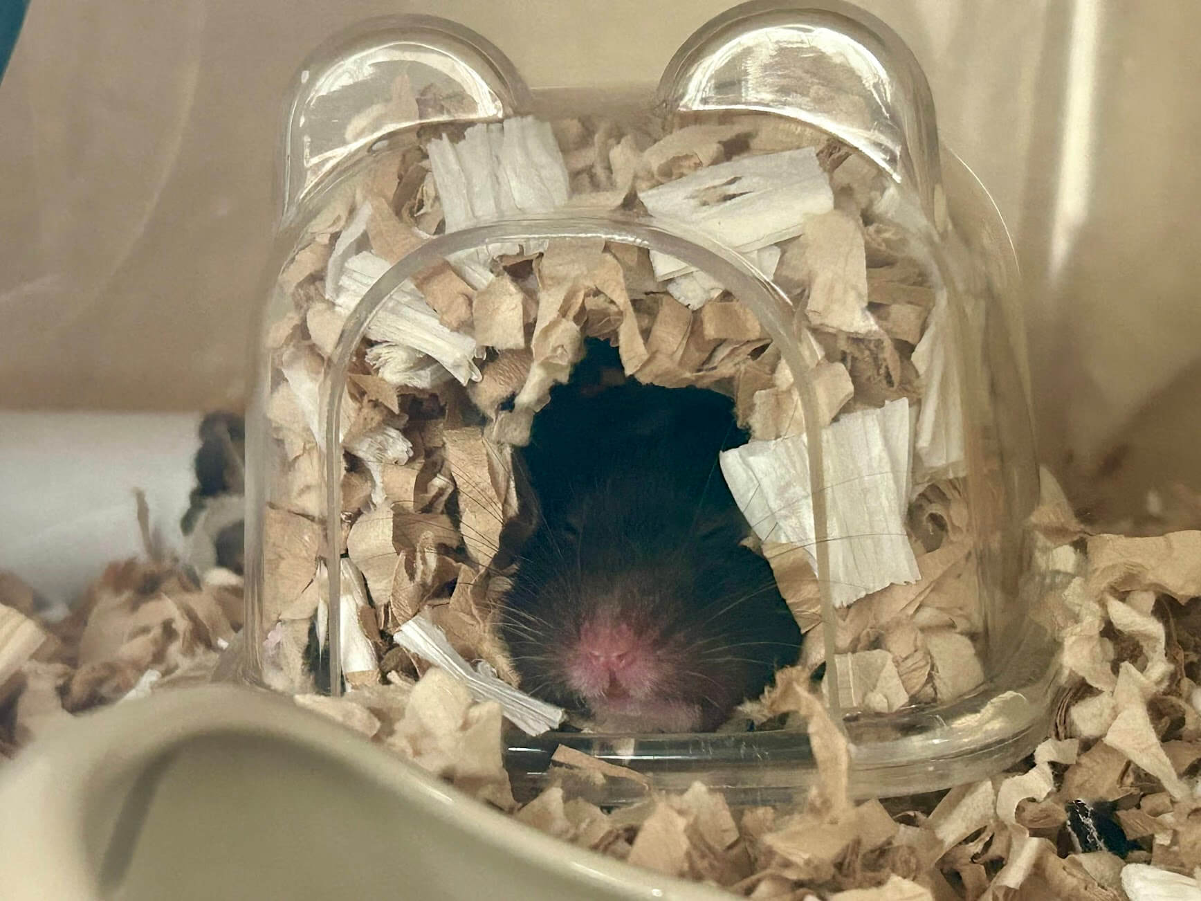 床材ぱんぱんのハウスからピンクの鼻だけヒクヒクさせて「おはよう〜」と声をかけると伸び〜をしながら出てきます。