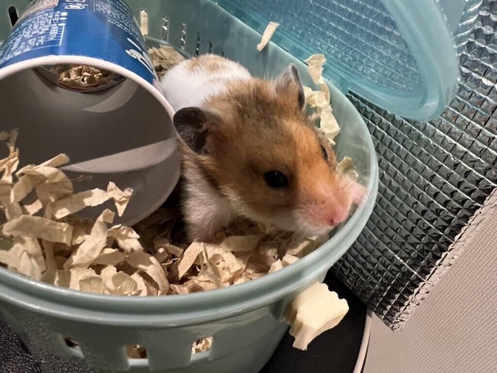 病院移動中は動かずに様子を見守っていた感じですが、ケージに着き、トイレに入ったら迷わず用を足していました。いつも思いますがハムスターのトイレ察知能力に感心します☺️