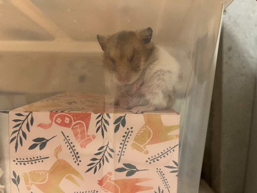 ハウスも設置してますが、籠るよりはハウスの上に乗ってうたた寝し始めています。(なぜ…) 現在の衣装ケースは高さが低めですが、高さのある衣装ケースが好ましいハムさんかもしれません。健診では細かい月齢が判明しないので1歳前後ですが、お顔はベビーフェイス寄りで、半年くらいのあどけなさも見られます。