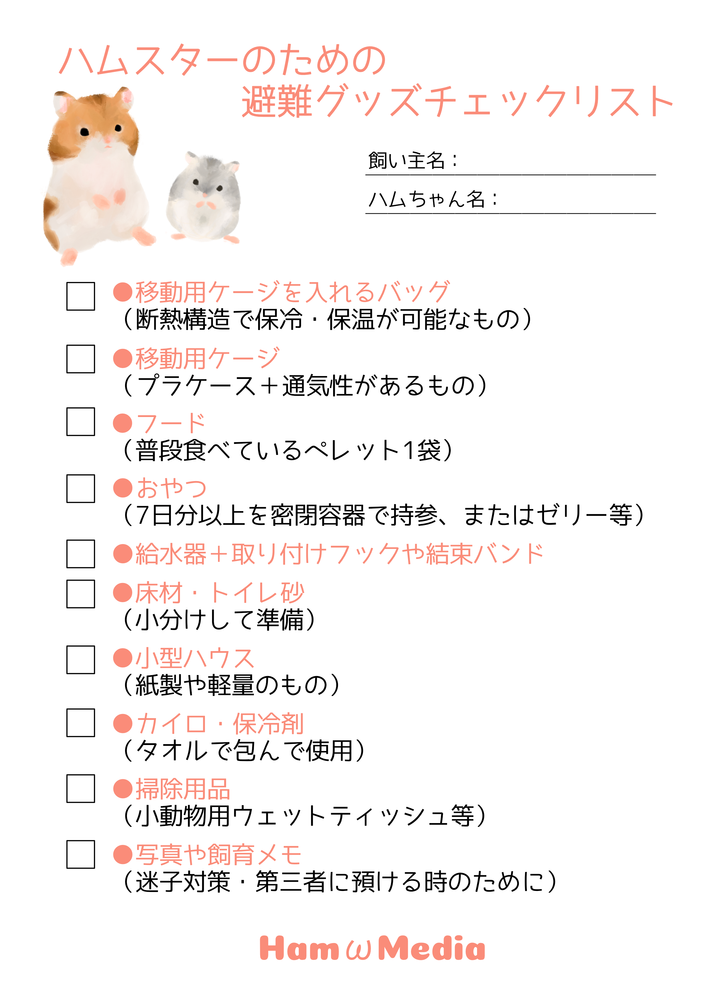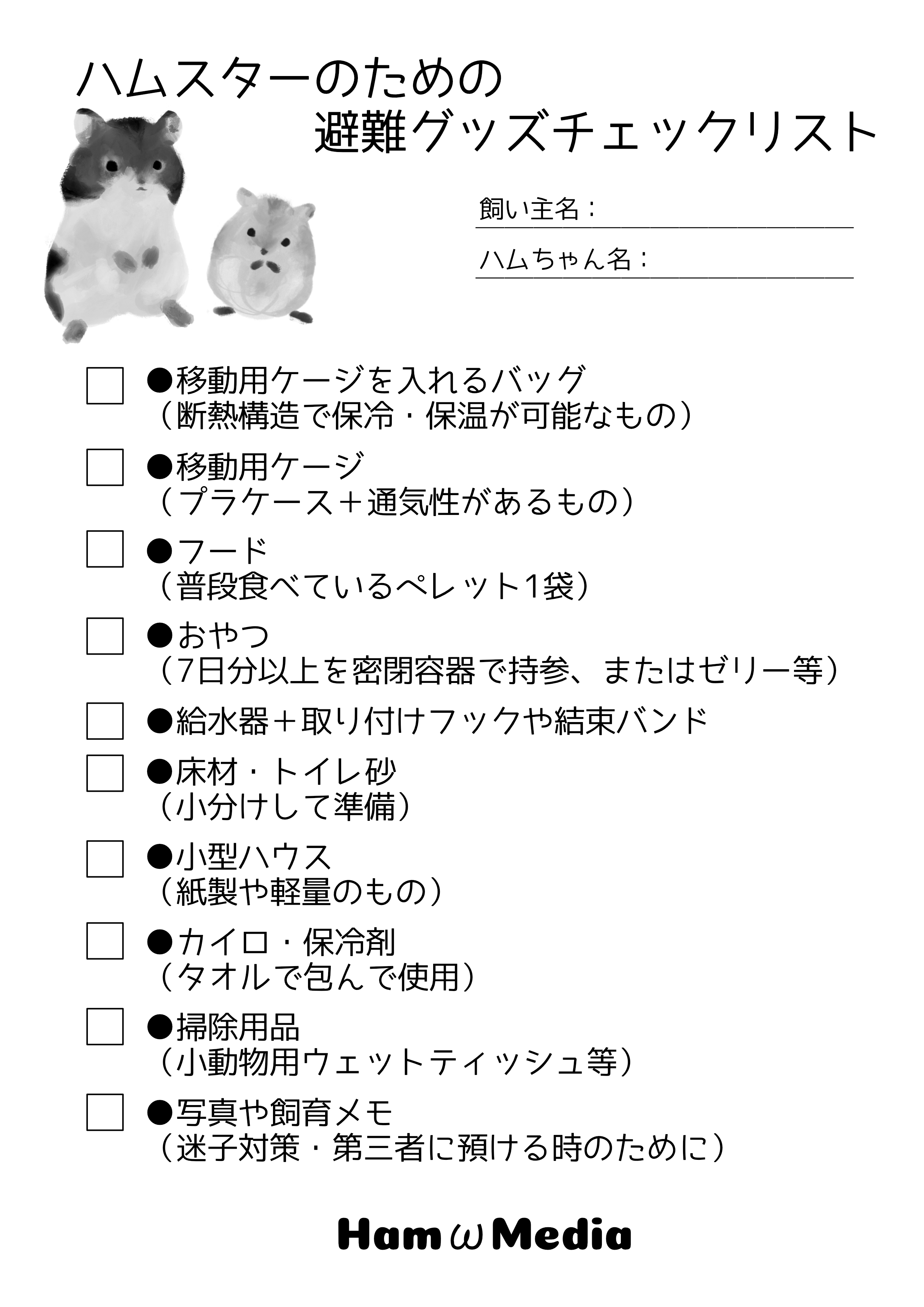 災害は前触れなく発生し、電気・水道・ガス・インターネットといったライフラインが止まってしまうこともあります。 人間であれば、なんとか自力で数日耐えることができるかもしれません。しかし、ハムスターなどの小動物はそうはいきません。 だからこそ、日頃からの備えが、命を守るために何よりも大切なのです。※避難グッズチェックリストは下記よりダウンロードして、印刷してもお使いいただけます。
